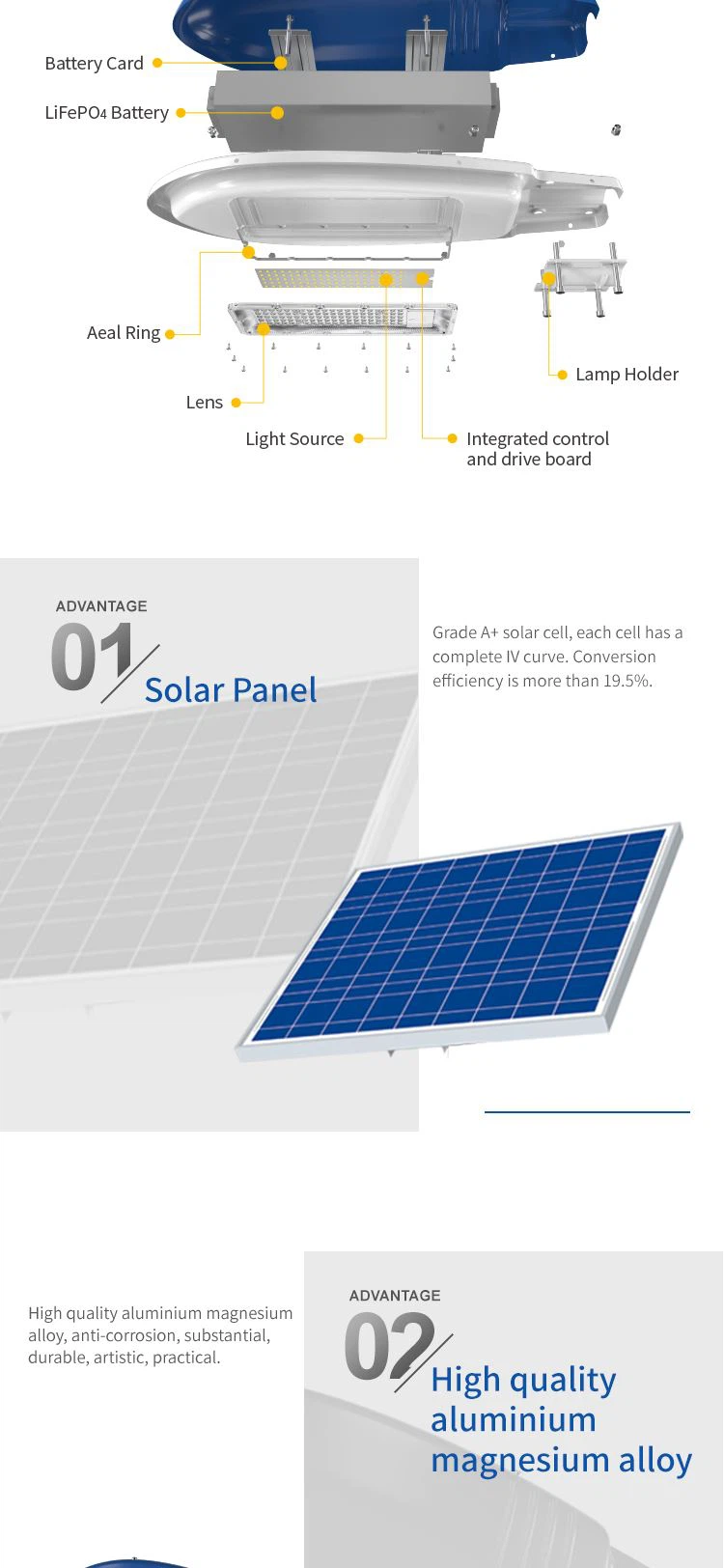 - Đặc tính chống lão hóa của thấu kính, cũng như khả năng chống đổi màu và biến dạng, đảm bảo hiệu suất chiếu sáng nhất quán theo thời gian. Với thấu kính quang học PC, đèn đường năng lượng mặt trời cung cấp ánh sáng rõ ràng, đồng đều giúp tối đa hóa chiếu sáng và sự an toàn.